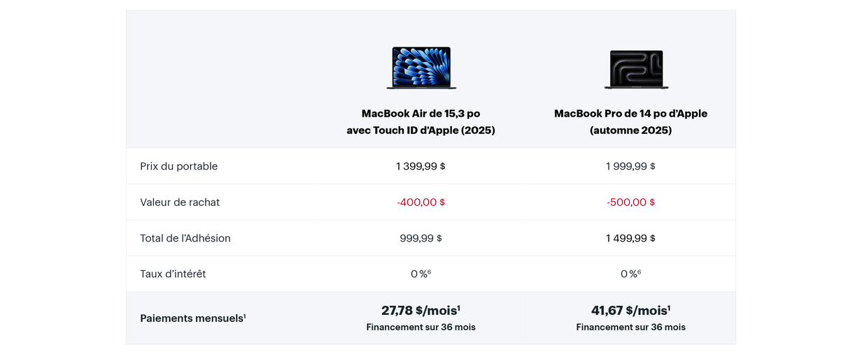 Faites une demande auprès de notre partenaire de confiance la MD La Fairstone Financière Inc pour obtenir le financement de votre nouveau portable. Si votre demande est approuvée, vous profiterez de paiements mensuels modiques pendant 36 mois, basés sur le prix de votre appareil, moins la valeur de rachat¹.