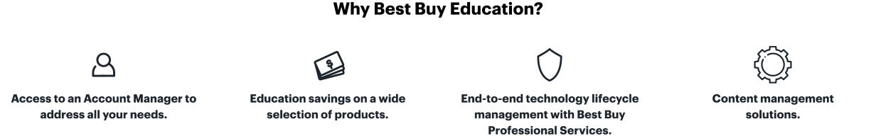 Best Buy Education is here to assist you in creating a successful learning environment for universities, colleges, and other post-secondary institutions. You can work with our Account Managers to place large orders with education pricing and flexible payment options including Net 30 credit account (based on eligibility), credit card, and more.