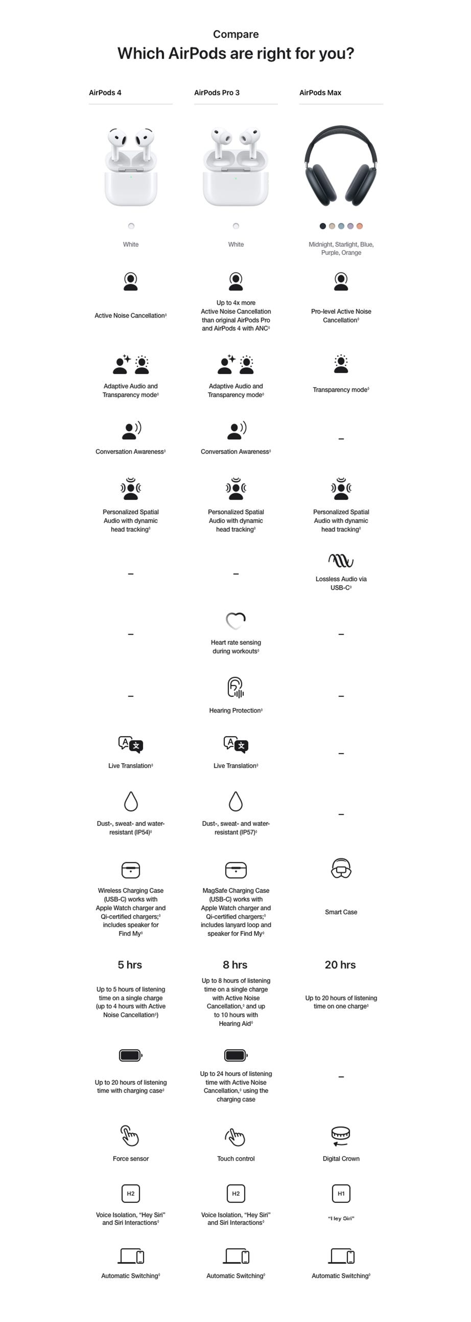 Battery Life: 67% more battery life compared with AirPods Pro 2. Battery life depends on device settings, environment, usage and many other factors. Testing conducted on AirPods 4 with Active Noise Cancellation, AirPods Pro 3 and AirPods Max with noise control on.