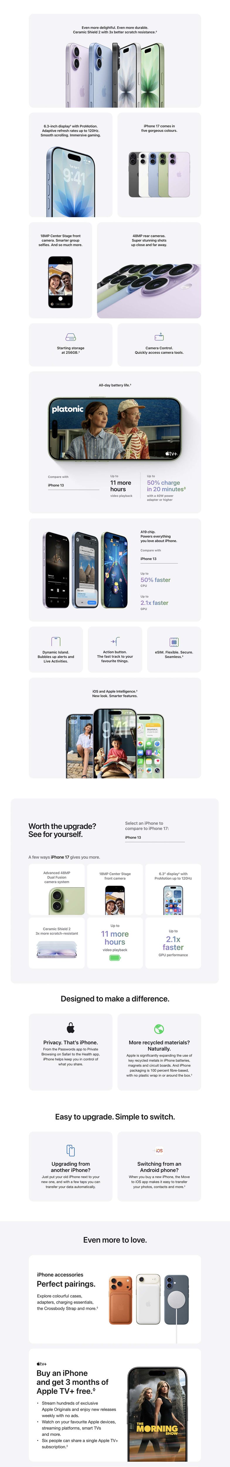 Display Size: The display has rounded corners. When measured as a rectangle, the screen is 6.86 inches (iPhone 17 Pro Max), 6.55 inches (iPhone Air), 6.27 inches (iPhone 17, iPhone 17 Pro) or 6.06 inches (iPhone 16e) diagonally. Actual viewable area is less.