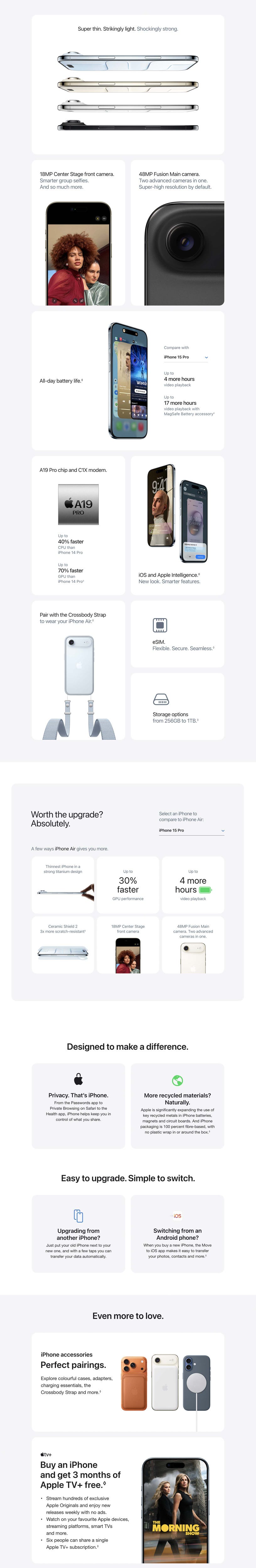 eSIM: iPhone 17 and iPhone Air models are activated with an eSIM and do not support a physical SIM. Use of an eSIM requires a carrier that supports eSIM and a wireless service plan. See your carrier for details. To learn more, visit apple.com/ca/esim.