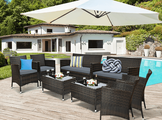 (929)$309.99SAVE $590$309.99Costway 4PCS Patio Rattan Furniture Set Cushioned Loveseat Table Shelf Gray