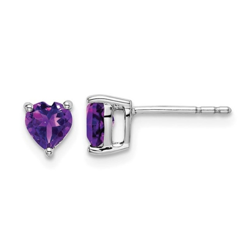 Sizzling heart shaped purple amethysts gemstones of 0.985 carats (ctw), are gently set into crisp polished 14 karat white gold. These solitaire gemstone earrings offer unique style and quality and feature the birthstone for the month of February.