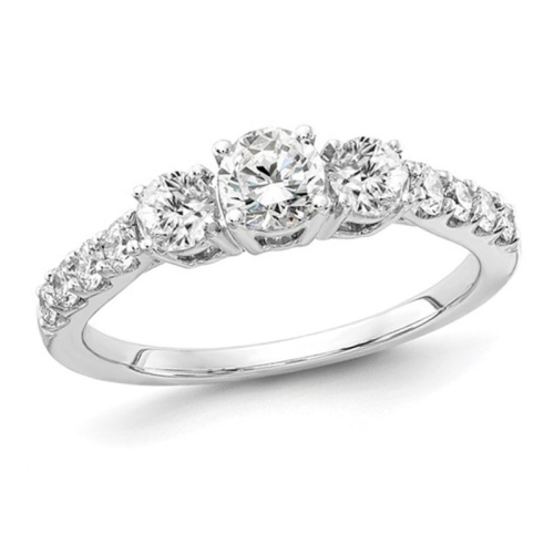 Polished gleaming 14 karat white gold is the foundation for a stunning three-stone diamond anniversary engagement ring featuring a sparkling (ctw Color D-E-F, Clarity VS+) lab grown diamonds with a total carat weight of 0.996 carats (ctw). This three stone style has 1/3 carat (center) supported by an an additional 10 diamonds on both sides. Lab grown diamonds are man-made diamonds that are chemica