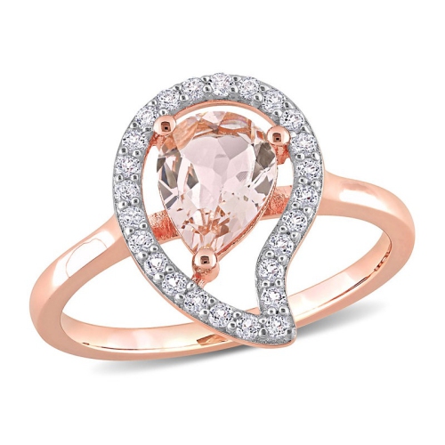 This pretty halo teardrop ring is crafted in lustrous rose plated sterling silver and features a morganite gemstone at the center with white topaz gemstones studded in a cut-work teardrop motif for giving bold and stylish look. Polished to a brilliant shine, this flickering ring is the perfect addition to any jewelry collection. Be prepared to dazzle everyone with this radiant and classic teardro