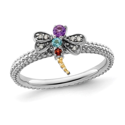 This unique multi-gemstone ring features a beautiful round purple amethyst , a brilliant round garnet and round swiss blue topaz all set into a sleek sterling silver foundation. Total gem weight is 0.11 carats (ctw). In addition tiny accent diamonds add a little extra sparkle to this animal inspired dragonfly ring.