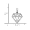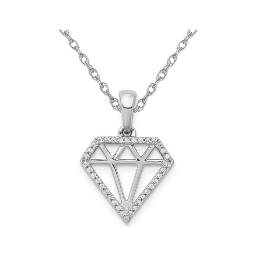 Crisp 14 karat white gold is crafted into a diamond shaped charm pendant with 1/10 carat (ctw) of sparkling round diamonds dangles from an 18 inch chain included. This beautiful charm necklace offers style and fashion in one beautiful package. The pendant is 1/2 inch in length and width and weighs 0.85 grams.
