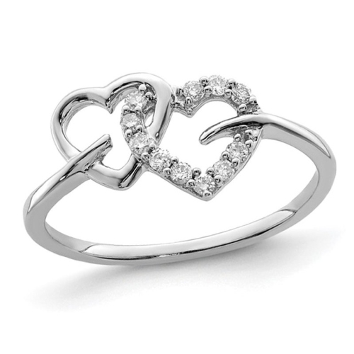 A cute double heart motif is set with with striking brilliant white diamonds that sit in the embrace of polished sleek sterling silver.