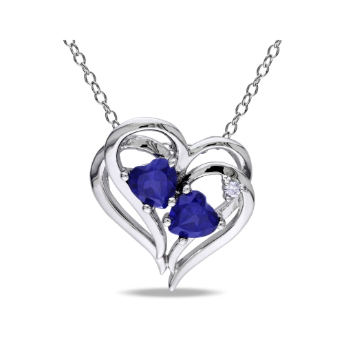 This chic pendant necklace displays interlocking hearts of sterling silver cradling two deep lab-created blue sapphire hearts and a round brilliant diamond accent, for a total of 1.10 carats (ctw). Matching earrings and ring are available. Blue sapphires are the featured September birthstone.