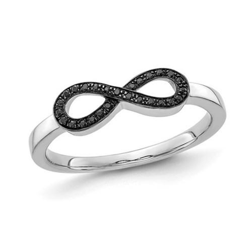 Crisp gleaming 14 karat white gold intertwines into a classic infinity motif set with with striking bold black diamonds 1/12 carats (ctw). This fashion forward ring is both offers both style boldness at the right price.