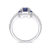 Accessorize effortlessly with this intricately designed halo Ring. Crafted in lustrous sterling silver, this detailed halo ring features three square-cut, two round cut prong set, bezel set lab-created blue sapphire gemstones (2x2mm) (3x3mm) forming the vertical center encased in a halo design created by 54 round cut prong set lab-created white sapphire gemstones (1.3x1.3mm). Enhanced with a polis