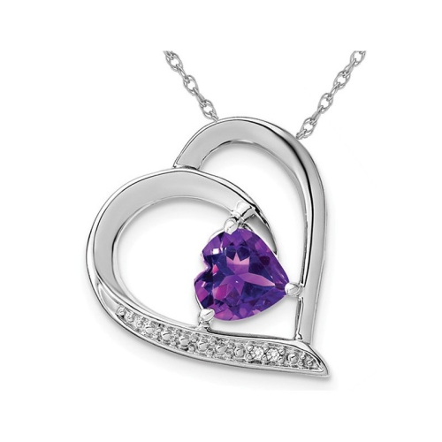 A beautiful gemstone amethyst pendant featuring a heart cut stone set in sleek rhodium plated sterling silver and including a matching 18 inch chain.