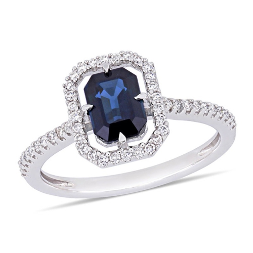This unique blue sapphire floating halo ring is crafted in gleaming 14-karat white gold and features an octagon-cut, prong set blue sapphire at its center with 48 round cut, buttercup set sparkling diamonds in a floating halo as well as studded along its band. Whether worn as an engagement ring or simply a gorgeous gemstone addition, this ring is sure to add a touch of elegance and style to any en