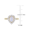 Add a versatile piece to your collection with this classic pear shaped halo ring. Crafted in lustrous 10 karat yellow gold, this exquisite ring features a pear-cut, prong-set opal decorated with a halo of lab-created prong set white sapphire gemstones and four pave set accent diamonds (G H-I, I2-I3) embellished halfway on both sides of the band in marquise designs. Enhanced with a high polished fi