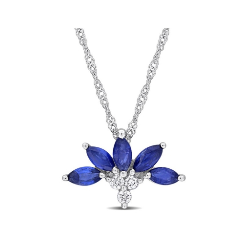 If you are looking for a stunning gift for someone special, look no further than this delicate floral pendant with chain in gleaming 14 karat white gold. This charm flower inspired pendant features five natural blue sapphires in the center, surrounded by sparkling white diamond accents that create a beautiful contrast. The pendant hangs from an 18-inch chain that complements the elegant design. Th