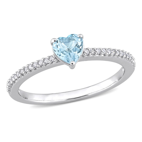 This charming solitaire engagement ring is crafted in 10-karat white gold. This attractive wedding ring features a sumptuous heart-cut sky-blue topaz stone raised over the delicate shank with 28 round-cut, prong-set white diamonds adding shimmer along its high polished band. Instantly add a touch of color, sophistication and class to any ensemble with this stunning gemstone bridal ring. This birth