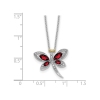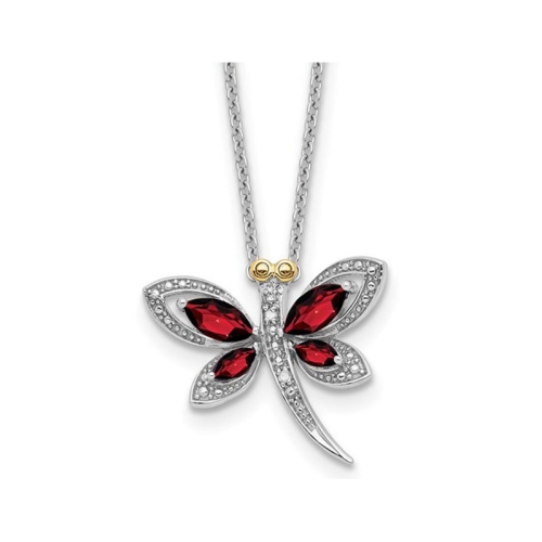 A playful dragonfly is adorned with gemstones of rich red garnets the featured birthstone of January all prong set into polished sterling silver. Add an endearing and youthful touch to your everyday with this unique accessory that includes a 18 inch silver chain.