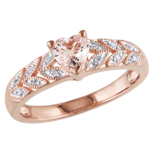 A rosy heart-shaped Morganite gleams from the center of this stylish 0.56 carat (ctw) ring. The band features a chic design of rose plated sterling silver with diamonds and milgrain detailing.