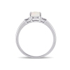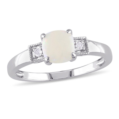 This pretty and simple ring features a cushion shaped cabochon opal center stone flanked by two tiny round white accent diamonds. This gorgeous ring is set in sterling silver and is enhanced with a miligrain finish. Opal is the featured October birthstone.
