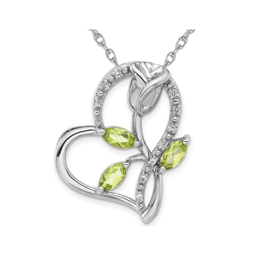 A beautiful heart shaped sterling silver foundation with natural green peridot and white topaz gemstones. This Rose flower inspired peridot heart pendant necklace includes an 18 inch sterling silver chain. Peridot is the featured birthstone for the month of August.