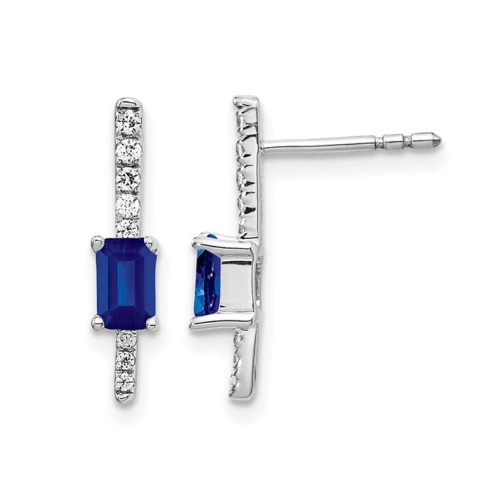 Beautiful blue sapphire emerald-cut gemstones 0.360 Carats (ctw) the birthstone for September are prong set into striking 14 karat white gold in these fancy stick inspired gemstone earrings. Sixteen stunning sparkling white diamonds for a diamond weight of 0.135 carats (ctw) sit above and below the blue gems in these geometrically styled dangle earrings that will surely impress.