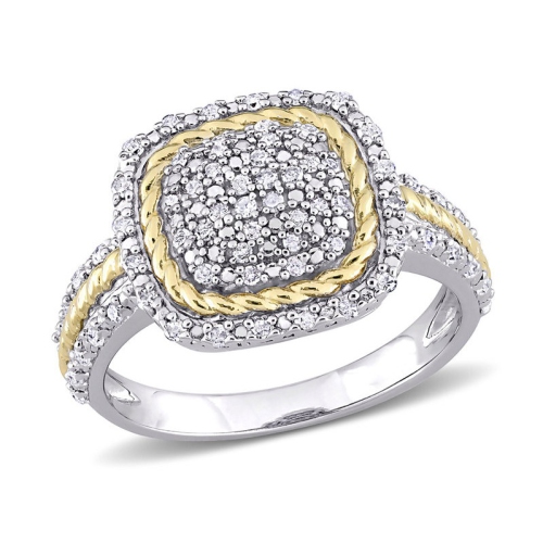 This elegant cluster halo square ring is crafted in two tone white and yellow sterling silver. This lovely cluster ring features 70 round pave-set twinkling diamonds clustered together in a unique pattern for a trendy design. Enhanced with a polished finish, this gorgeous ring will add an extra touch of shine to your favorite look.