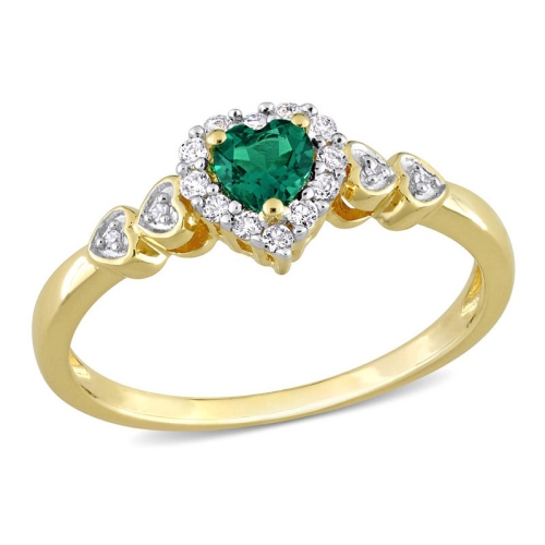 Dazzle effortlessly with this beautiful heart halo ring. Crafted in lustrous yellow plated sterling silver, this royal ring features a heart cut, prong-set created emerald decorated with a halo of 12 created white sapphire gemstones and four pave set diamonds (G H-I, I2-I3) embellished halfway on both sides of the band in heart designs. Enhanced with a high polished finish.