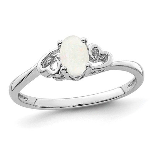 A beautiful smooth opal gemstone sits in the embrace of a sleek rhodium plated sterling silver foundation in this heart ring featuring the birthstone for October.