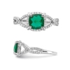 A solitaire cushion-cut lab-created green emerald gemstone 1.30 carats (ctw) sits in a crisp polished sterling silver foundation while 64 sparkling diamonds 3/10 carat (ctw) support the beautiful gemstone in a halo formation.
