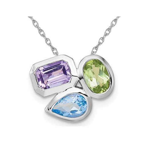 This unique colorful pendant features a brilliant oval green peridot, a pear shaped blue topaz and a octagon purple amethyst creating a geometric display. This pendant is set into polished sterling silver and includes an 18 inch silver chain.