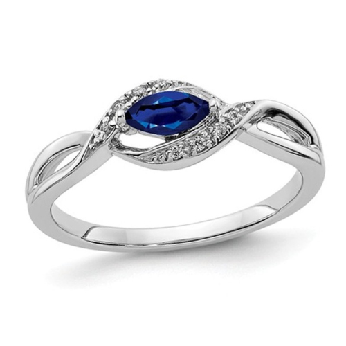 A solitaire natural marquise cut blue sapphire gemstone sits in the warm embrace of rhodium plated sleek 14 karat white gold in this classic gemstone ring. Sapphire is the birthstone for September. Tiny round accent diamonds complete the look.