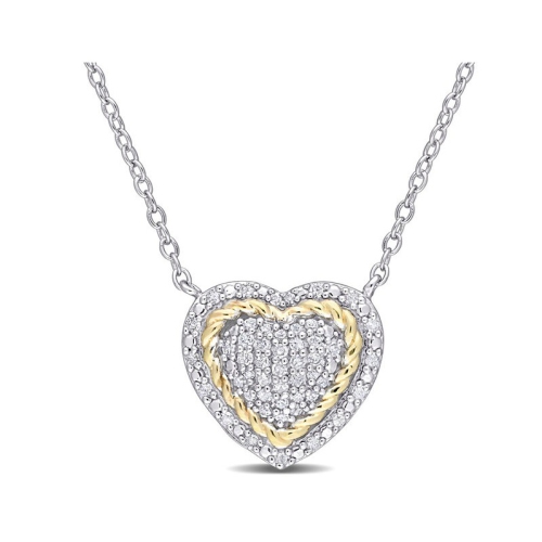 Draw immediate attention to your neckline with this Diamond Heart Necklace that adds eye-catching appeal to a scoop-neck dress or a V-neck blouse. Mounted in luminous white and yellow rhodium-plated sterling silver, this pendant features 49 round-cut, pave-set shimmering diamonds clustered at the center for a classy look. This diamond necklace measures 18-inches in length and secures with a spring