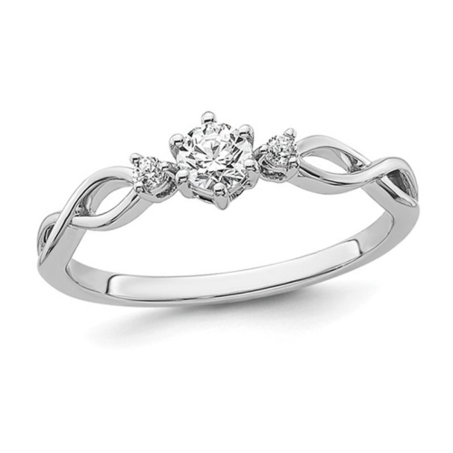 Polished shimmering 14 karat white gold is the foundation for a stunning three stone diamond promise ring featuring a sparkling 1/8 carat (ctw) brilliant diamond at its center supported by 24 additional brilliant sparklers on either side. This gold diamond ring has total carat weight of 1/4 carat (ctw).
