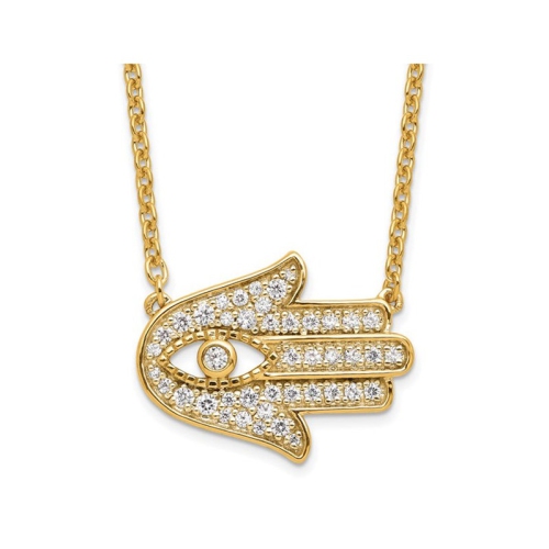 A symbol of protection, happiness and health, the Hamsa is a symbol dating back to ancient times. This pendant is beautifully crafted from 14 karat yellow gold. This pendant will make an ideal token of your best wishes for a loved one. With a sidesways design the pendants features 43 lab-grown sparkling diamonds for 0.27 carats (ctw VS1-VS2). Lab grown diamonds are man-made diamonds that are chemi