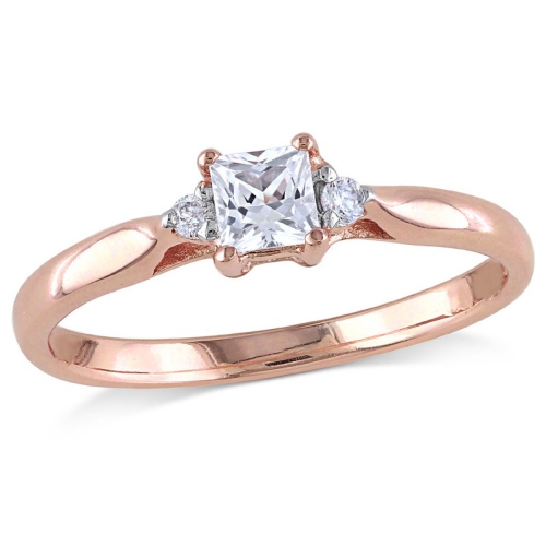 This lovely ring features a sleek design fashioned in rose plated sterling silver. The center stone is a brilliant, princess-cut white sapphire, elegantly prong set. The luminous stone is accented with two round-cut, prong set stones. This white sapphire promise ring is a beautiful way to make your intentions known.