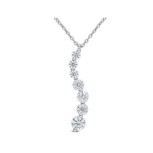 This elegant graduated journey necklace is crafted in lustrous sterling silver. This magnificent pendant features seven gleaming created white moissanite gemstones beautifully embellished in a graduated style. Enhanced with a high polish finish, this necklace is a valuable addition to any jewelry collection. This style represents the combination of natural sophistication and beauty. Moisannite is