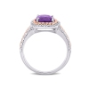 Be a trendsetter when you wear this amethyst and accent diamond halo ring. Crafted in lustrous rose rhodium plated sterling silver, it features a cushion cut amethyst gemstone (7x7mm) at the center with 32 round prong set accent diamonds (H-I, I2-I3) forming a halo and resting along the two tone band. Polished to a brilliant shine, this gemstone and diamond ring makes the perfect addition to any j