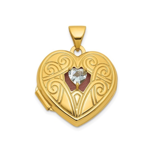 Classic and versatile, this precious heart locket pendant is fashioned in shimmering 14 karat yellow gold. A translucent clear heart shaped aquamarine genmstone sits at the center of the beautifuk locket. This locket pendant is 4/5 inches wide and 4/5 inches long and weighs 1.60 grams. Aquamarine is the featured March birthstone.