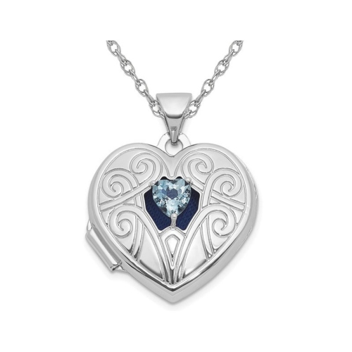 Classic and versatile, this precious heart locket pendant is fashioned in sleek sterling silver. A translucent clear heart shaped aquamarine genmstone sits at the center of the beautiful polished locket. This locket pendant is 4/5 inches wide and 4/5 inches long and weighs 1.95 grams. Aquamarine is the featured March birthstone. This pendant includes an 18 inch silver chain.