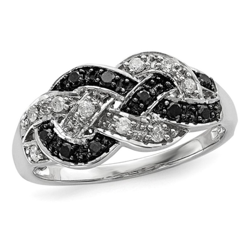 This intertwined love knot style designed ring is crafted from sleek rhodium plated sterling silver highlighted by 1/5 carat (ctw) of stunning black and white diamonds.