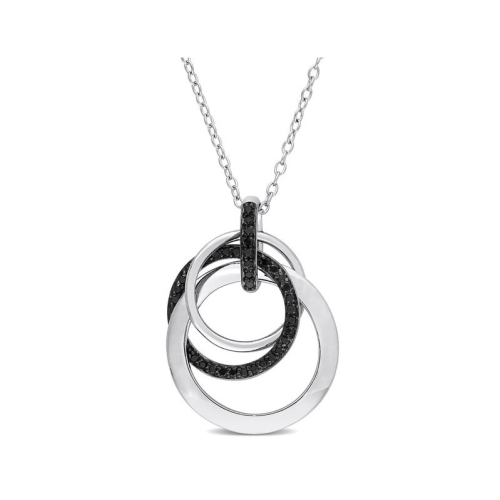 This pretty interlocked circle pendant is crafted in lustrous black rhodium plated sterling silver. This trendy pendant features 43 prong set black diamonds placed in an open circular motif and the loop holding the circles. This diamond pendant also showcases two silver open circles giving it a captivating look. Enhanced with a high polished finish, this circle pendant is suspended on an 18-inch r