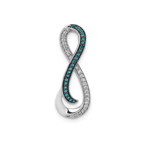 Beautiful color enhanced icy blue diamonds highlight this unique inifnity pendant and is contrasted by sparkling white diamonds all set into a striking rhodium 14 karat white gold foundation This gold pendant does not include a chain. This inifinty style is 1 inch in length.