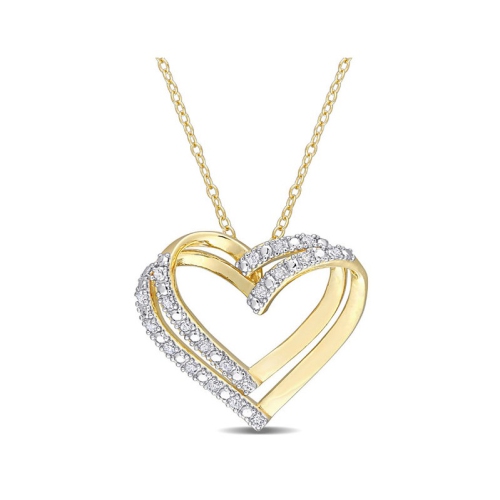 Gorgeously romantic is this trendsetting Diamond Double Heart Pendant. Crafted in sparkling yellow rhodium-plated sterling silver, this pendant features 20 round-cut, prong-set shimmering diamonds forming the outline of a double heart. Enhanced with high polish finish, this diamond pendant is suspended on an 18-inch round cable chain that secures with a spring ring clasp. Gift this distinctive dia