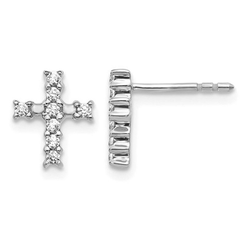 Crisp rhodium plated 14 karat white gold is crafted into cross shaped post earrings highlighted by sparkling white lab grown diamonds 1/5 Carat (ctw G-H-I, SI1-SI2) in these stunning earrings. Lab grown diamonds are man-made diamonds that are chemically, physically, and optically identical to diamonds originating from nature. Both have the same chemical composition and atomic structure, producing