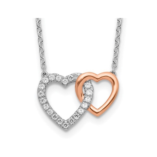 Twenty stunning high quality, clear lab-grown diamonds 1/5 Carat (ctw SI1-SI2, H-I) sit encrusted within a polished gleaming 14 karat white and rose pink gold twin heart shaped designed pendant with matching 18 inch gold chain. Lab grown diamonds are man-made diamonds that are chemically, physically, and optically identical to diamonds originating from nature. Both have the same chemical compositi