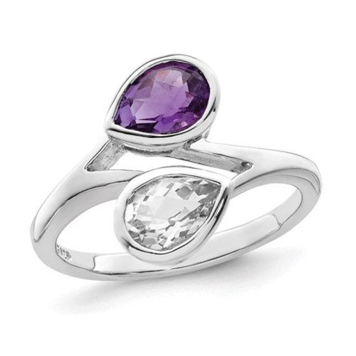 A Stunning pear shaped tear drop amethyst is matched to white topaz in this unique ring crafted from sleek sterling silver. This ring features the birthstone of February in a new special look.