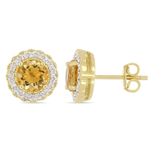 These earrings feature round-cut Citrine stones 1.50 carats (ctw) surrounded by round-cut sparkling Diamonds 1/10 carats (H-I, I2-I3). This classic pair is set in Yellow plated sterling silver and are secured with butterfly backs. Citrine is the birthstone for the month of November.