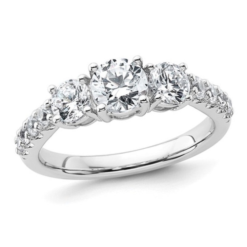 Polished gleaming 14 karat white gold is the foundation for a stunning three-stone diamond anniversary engagement ring featuring a sparkling (ctw Color D-E-F, Clarity VS+) lab grown diamonds with a total carat weight of 1.526 carats (ctw). This three stone style has 3/5 carat (center) supported by an an additional 10 diamonds on both sides. Lab grown diamonds are man-made diamonds that are chemica