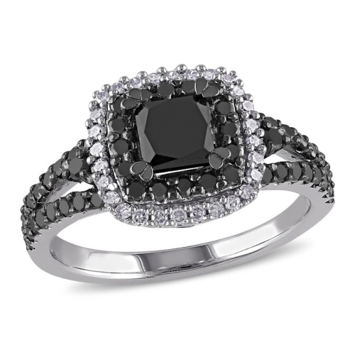 This charming double halo black diamond engagement ring features a center princess-cut bold black diamond surrounded by round black and white diamonds , all set in polished sterling silver. This classic ring is enhanced with a high polish finish.