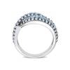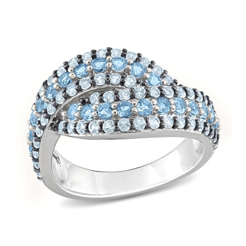 Cast a spell with this breathtaking sky blue topaz multi row crossover ring. Mounted in sleek sterling silver, this gemstone ring features 58 round (1.5x1.5mm) and 24 round (2x2mm) sky blue topaz gemstones in a shared prong setting, that are embellished on multiple rows in the swirl designed crossover band. This fashionable ring has been enhanced with a beautiful polished finish. Blue topaz is th